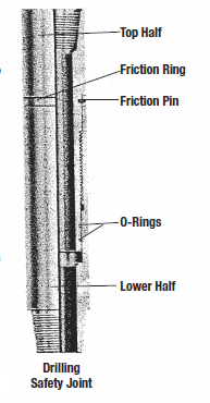 Operational Components The Crossover Safety Joint consists of a pin section, box section, and a friction ring. The internal connection of the safety joint is a coarse acme thread to facilitate easy backoff and reengagement. A knurled ring between the box and pin section maintains torsional integrity until backoff procedure is initiated. An O-ring seal contains pressure while the safety joint is made up.